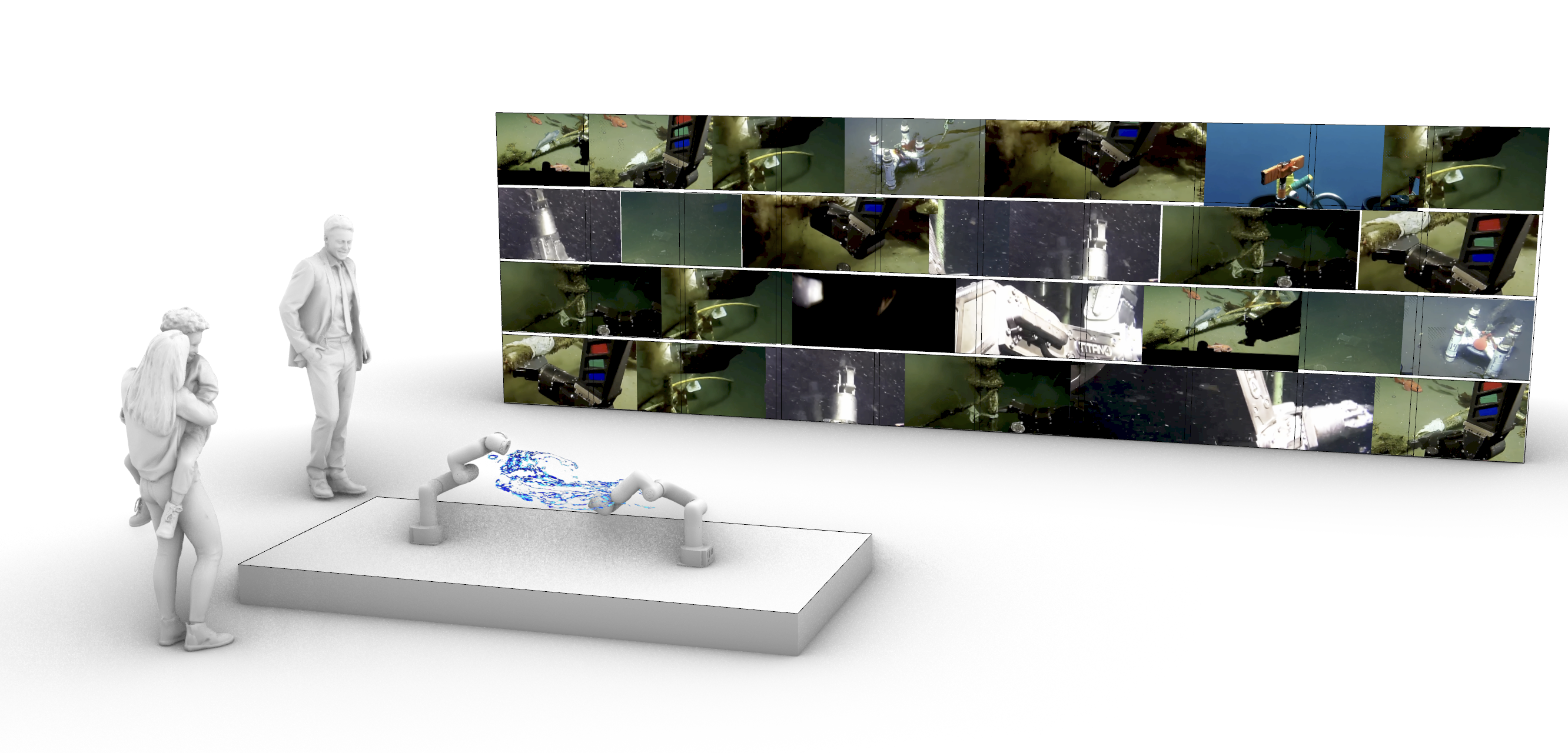 In this third iteration an oceanic pas de deux, a collage of videos on a projection wall show underwater, deep sea machines in the act of maintenance, such as supporting camera structures and replacing parts, or diving in and out of the water as part of their operational modes (Oceans 3.0 data portal). Nearby, a pair of robotic arms are robotic arms are trained to mimic their activities through a pose estimation workflow re-configured for non-humans and together construct, deform and collaboratively rework a virtual mesh of ocean currents, particle systems of blue swirls that move between them. This colorful interplay – a duet or pas de deux references pioneering animation artist Norman McLaren’s work of the same title where traces of two dancers are computationally generated and articulate the refrains/echoes of their movement. Alluding to the dual valence of ‘performance’ as both choreography and evaluation of a living system, Memory Machines #3: an oceanic pas de deux casts these machines as invisible performers in the act of sustaining the affordances of our visuality/knowledge of the deep sea. Returning them to the visibility on the surface, the robotic arms and video wall offer a revelatory potential within the space of the gallery.